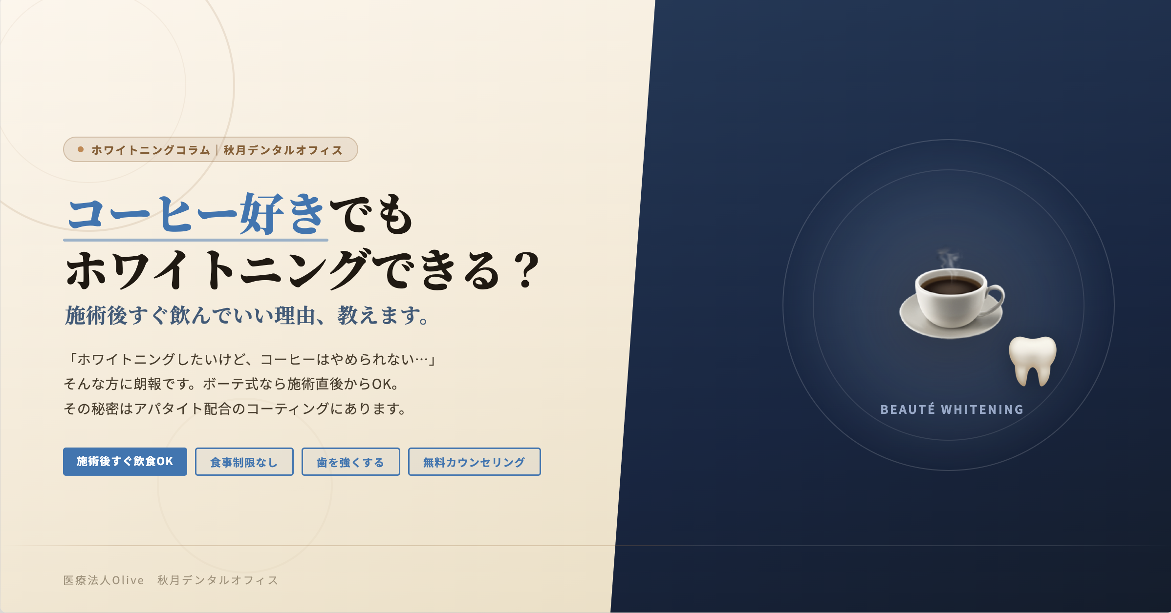 従来のホワイトニングでは施術後24〜48時間はコーヒー・赤ワイン・カレーなどを控える必要がありましたが、ボーテ式では施術後にアパタイト配合ペーストで歯の表面をコーティングするため、施術直後からコーヒーや紅茶もお楽しみいただけます。忙しい日常の中でも無理なく続けられるのが大きな魅力です。
