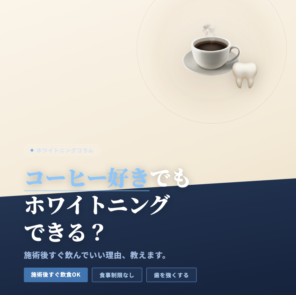 従来のホワイトニングでは施術後24〜48時間はコーヒー・赤ワイン・カレーなどを控える必要がありましたが、ボーテ式では施術後にアパタイト配合ペーストで歯の表面をコーティングするため、施術直後からコーヒーや紅茶もお楽しみいただけます。忙しい日常の中でも無理なく続けられるのが大きな魅力です。