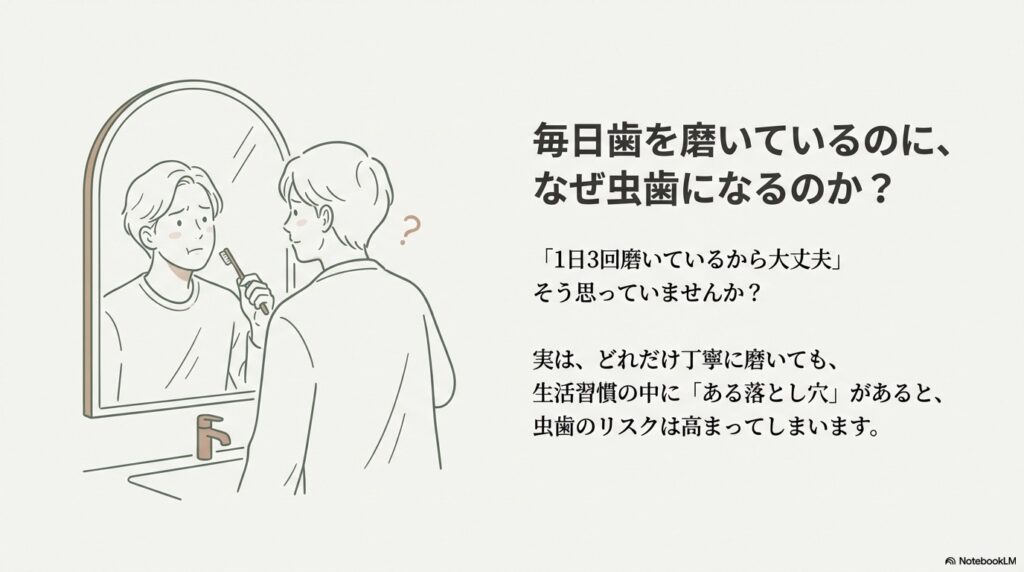 虫歯は「体質」と感じやすいですが、実際には生活習慣・磨き残しの癖・唾液の状態・過去の虫歯歴など、複数の要素の組み合わせで変わります。